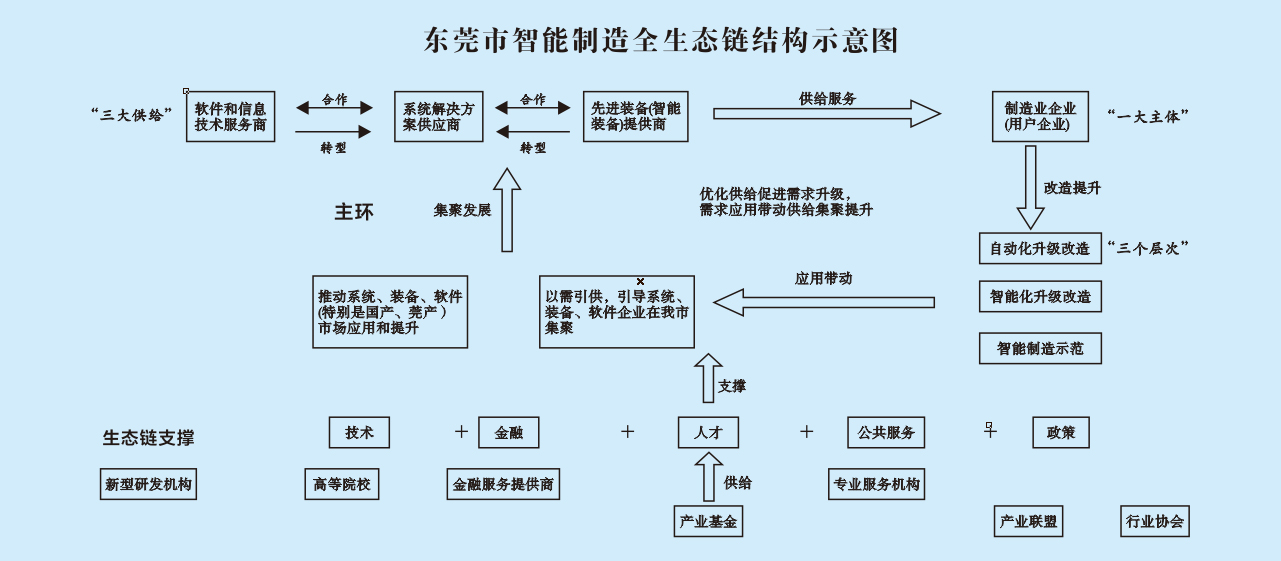 對接“中國制造2025”戰略,以國家《智能制造發展規劃(2016-2020年》、《“東莞制造2025”規劃》等為行動綱領,通過打造智能制造全生態鏈,系統提升資源配置供給水平,著力構建新型制造體系,培育經濟增長新動能,打造產業竟爭新優勢,推動東莞制造業在更高起點上實現更高水平發展。