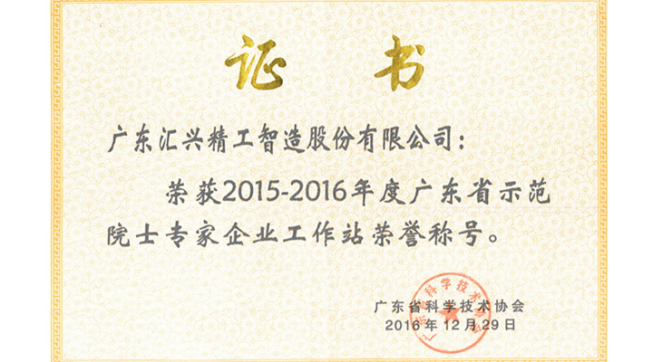 匯興智造榮獲2015-2016年度廣東省示范院士專家企業(yè)工作站榮譽稱號