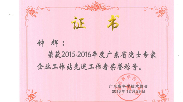 匯興智造董事長鐘輝榮獲2015-2016年度廣東省院士專家企業(yè)工作站先進工作者。