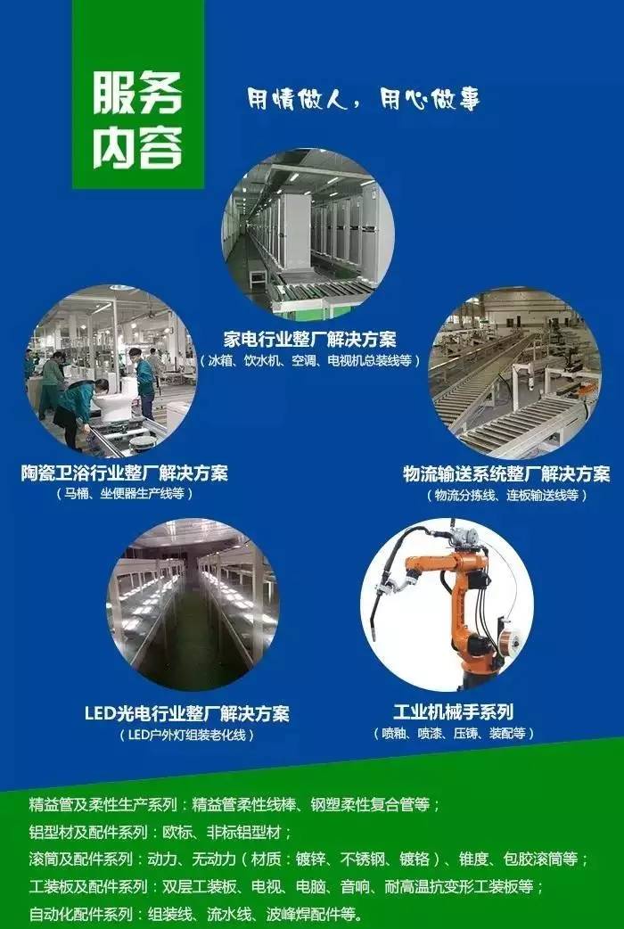 廣東匯興精工智造股份有限公司作為國家高新技術企業,正逐步成為全球領先的整廠自動化系統解決方案提供商,匯興智造家用電器、衛浴陶瓷、新能源、LED、汽車零部件、家具廚具、物流輸送、精密電子電器、醫藥食品、包裝印刷等細分領域提供整廠自動化系統解決方案及精密工業自動化配件一站式采購服務。其中,家電生產線是匯興智造的王牌產品,主要為:電冰箱、微波爐、空調、液晶電視機、熱水器、烤箱等制造企業提供智能自動化生產方案
