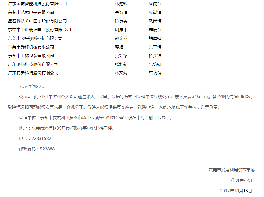 關(guān)于認(rèn)定東莞市第十一批上市后備企業(yè)公示的通告